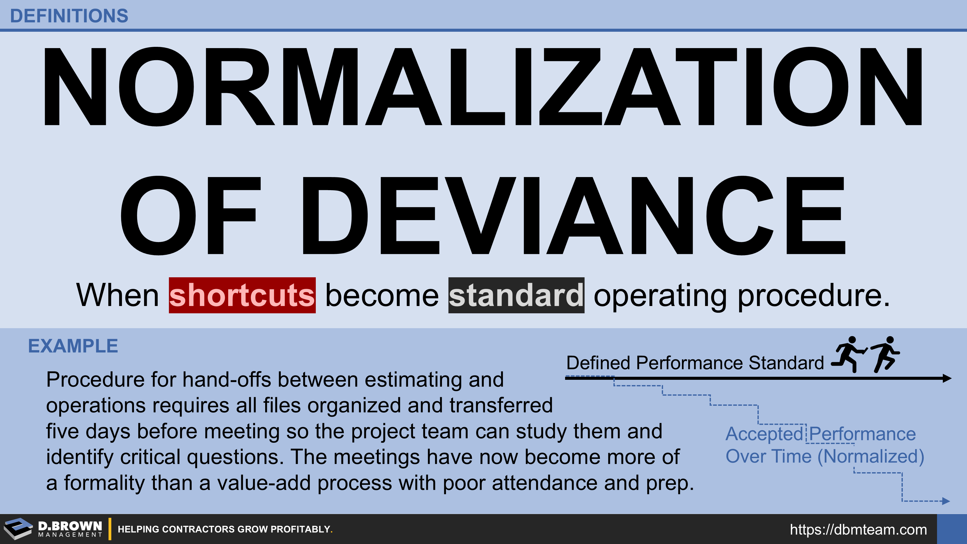 Normalization of deviance is when shortcuts become standard operating procedure. At best, this slows down development of individual and team capabilities. At worst, it increases catastrophic safety risks. In-between is just lost money, time, and people.