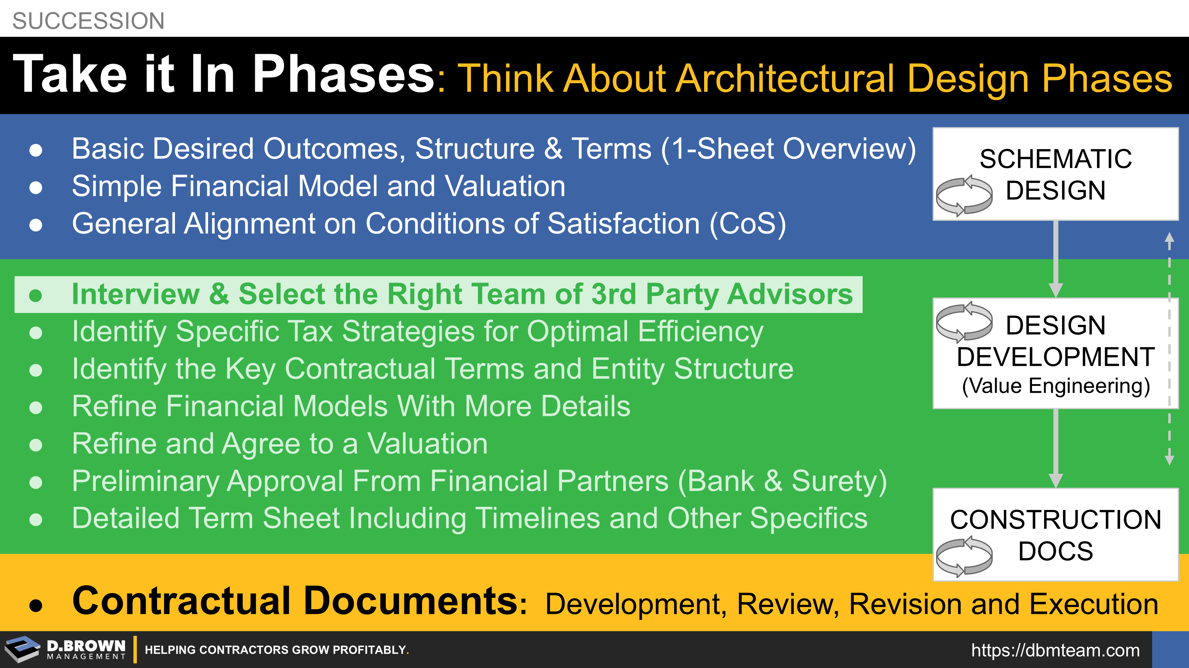Succession: Take it in Phases. Think about architectural design phases. Schematic design, design development, and construction documents.